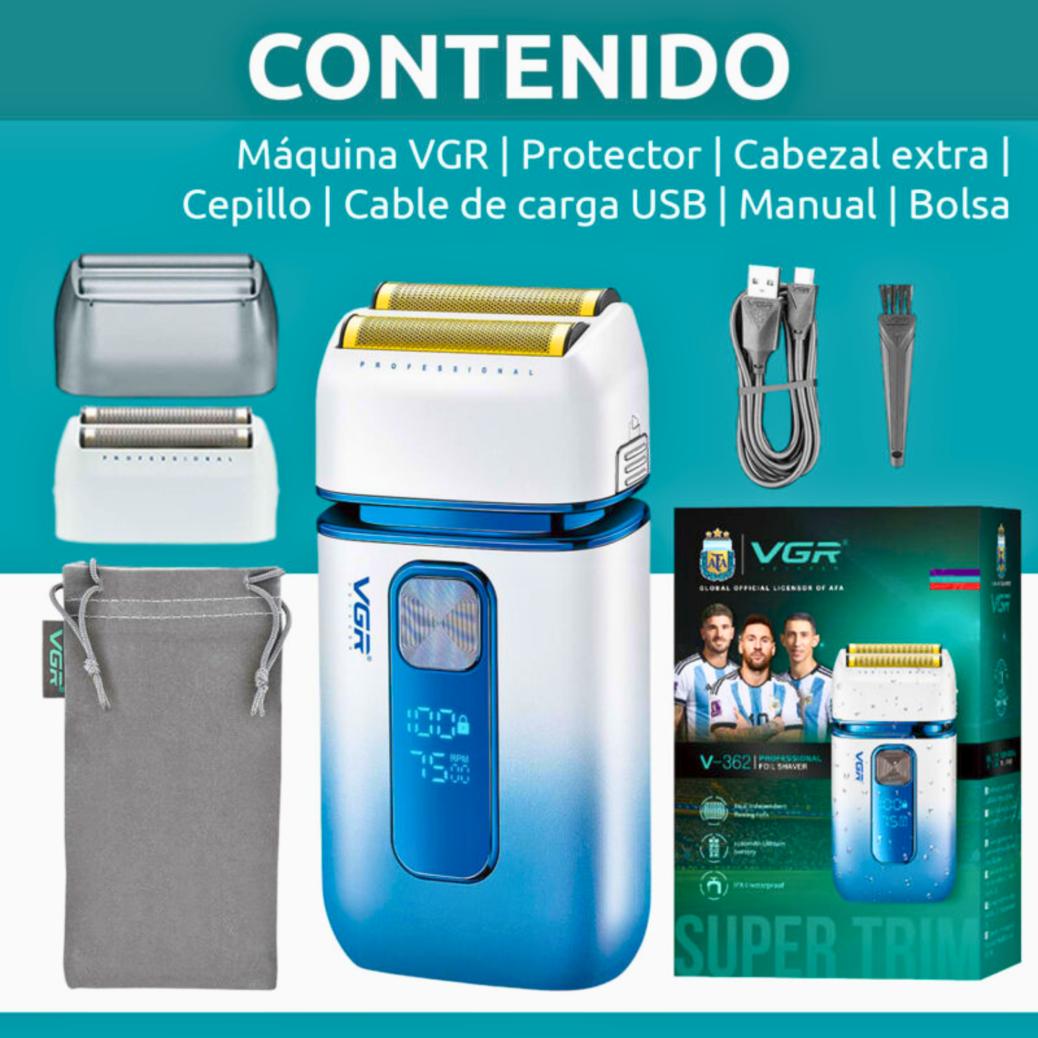 La VGR V-362 es una afeitadora profesional diseñada para brindar un afeitado rápido, cómodo y preciso. Su sistema 2 en 1 combina cabezales de lámina y trimmer desplegable, ideal para perfilar barba, bigote y patillas con acabado perfecto.