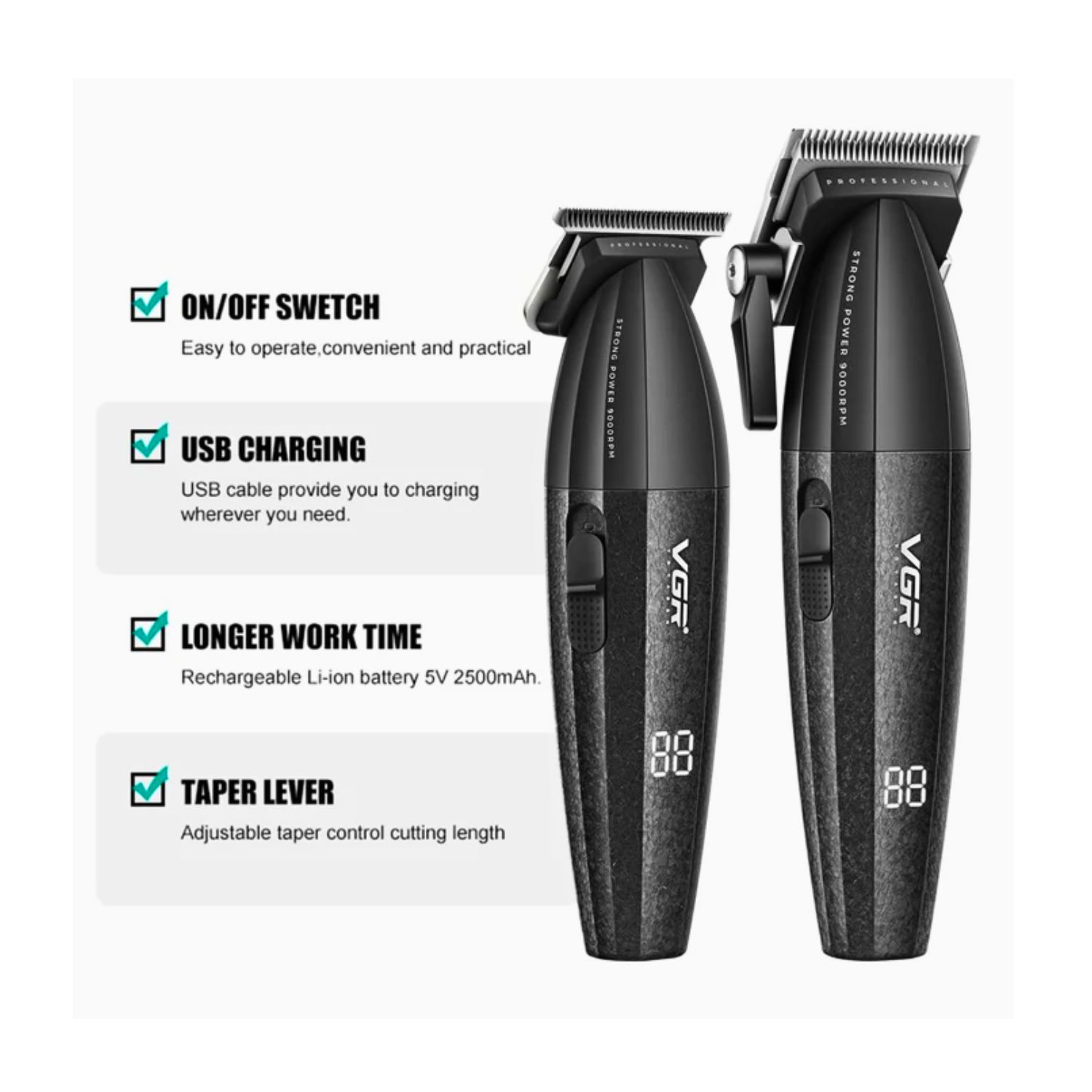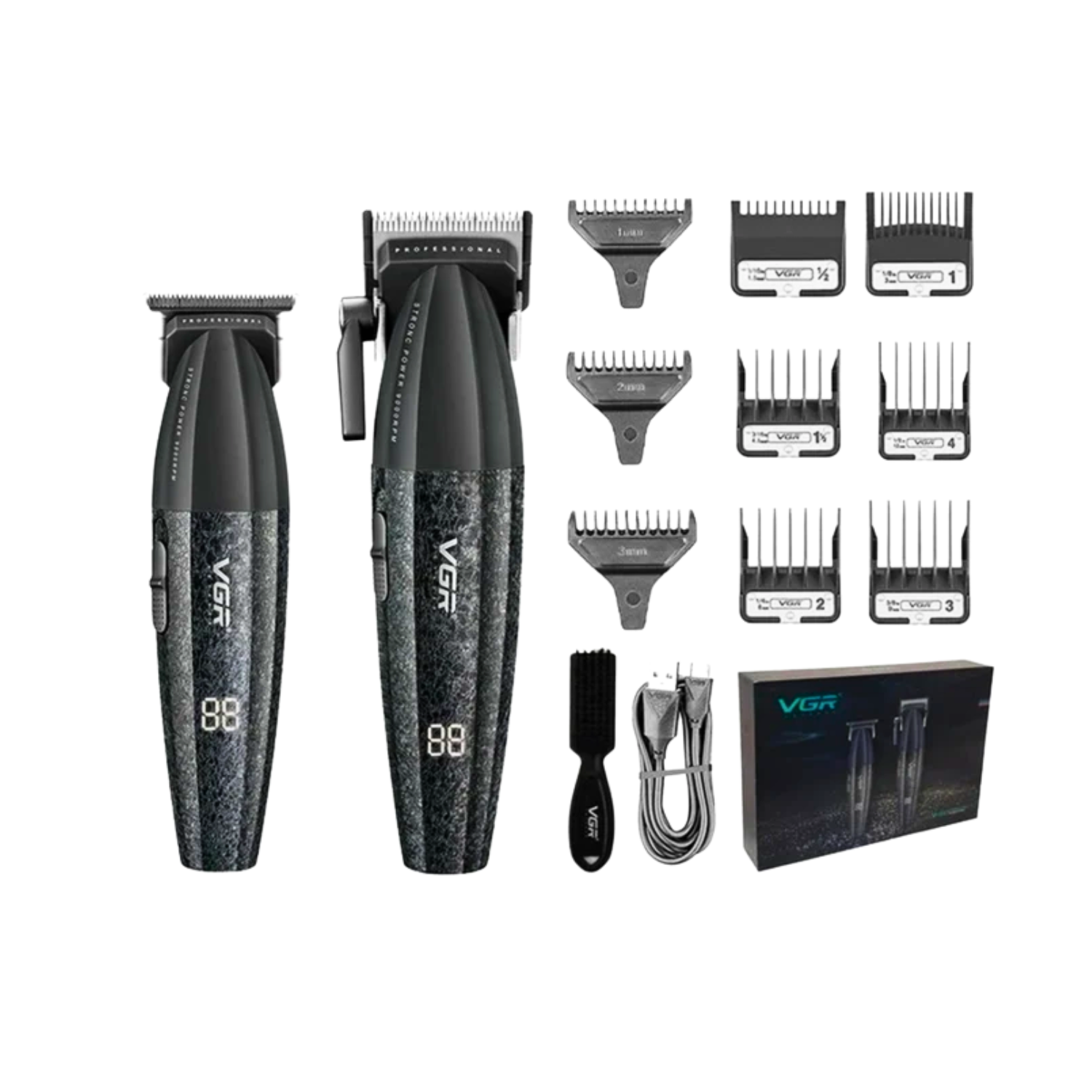 El Barber Combo VGR V-640 Profesional en color negro incluye una cortadora (clipper) y una patillera (trimmer) diseñadas para ofrecer un rendimiento potente, preciso y silencioso. Ideal para barberos profesionales y para uso personal exigente, este set garantiza un acabado perfecto en cortes, fades, delineados y detalles.