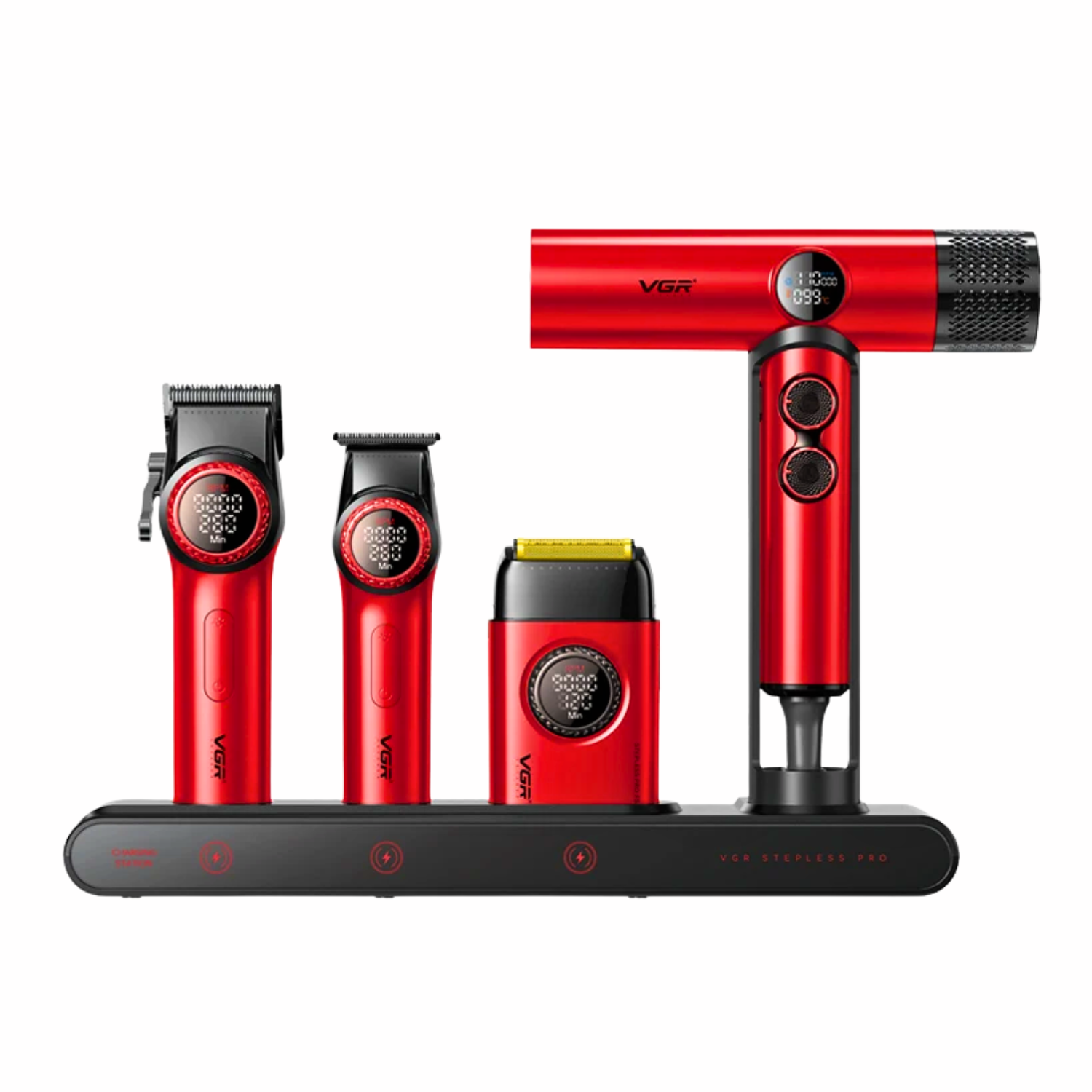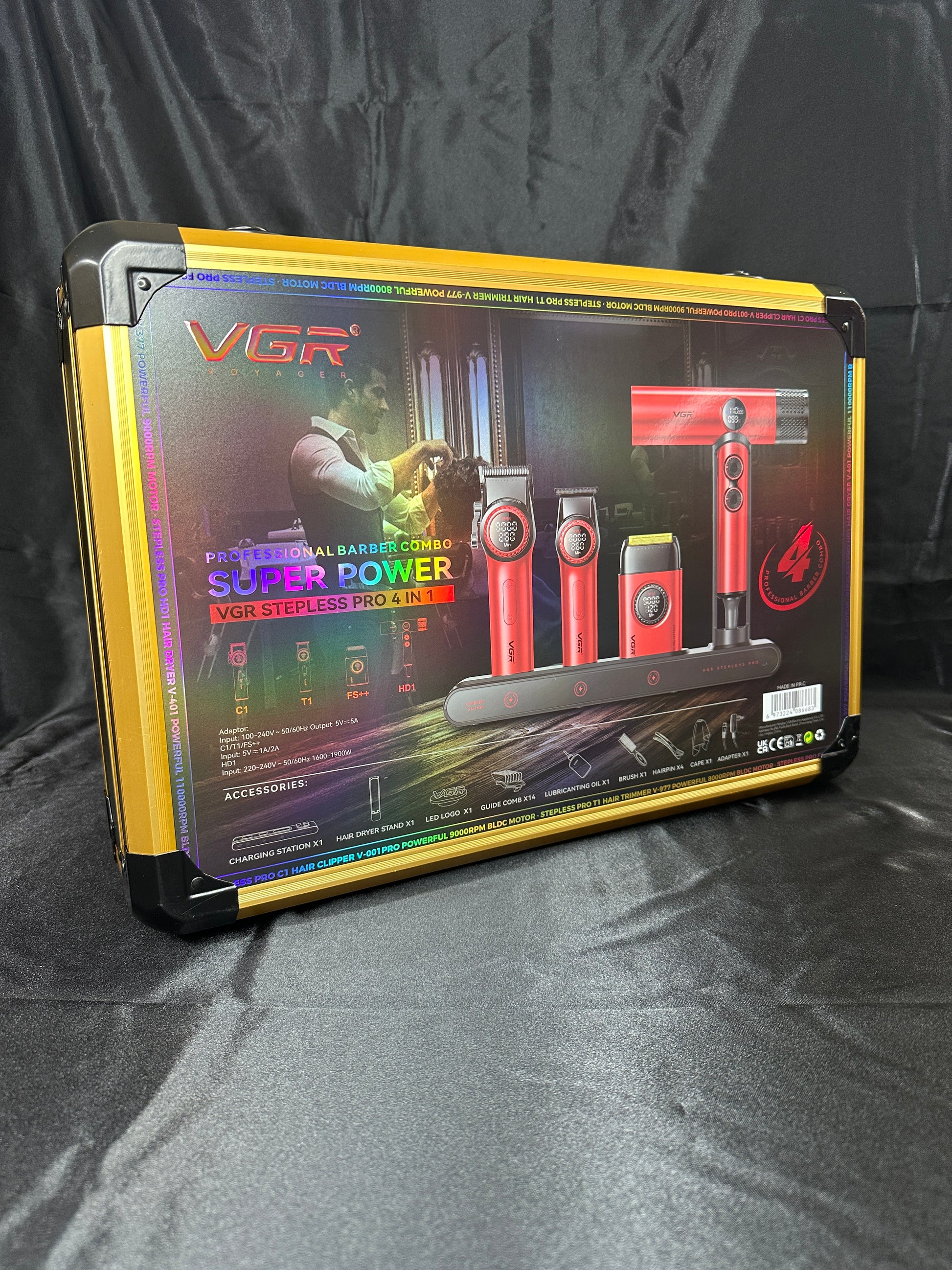 El Combo Kit VGR Professional 4 en 1 es un set completo y profesional diseñado para el cuidado y estilizado del cabello y la barba, ideal tanto para uso en barberías como para uso doméstico avanzado. Este kit reúne cuatro herramientas esenciales en una sola maleta práctica y portátil, facilitando su transporte y almacenamiento.